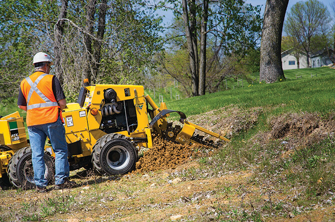 The walk-beside, center-articulated PTX40 plow/trencher is designed for installing fiber optic, electrical, gas and irrigation services.